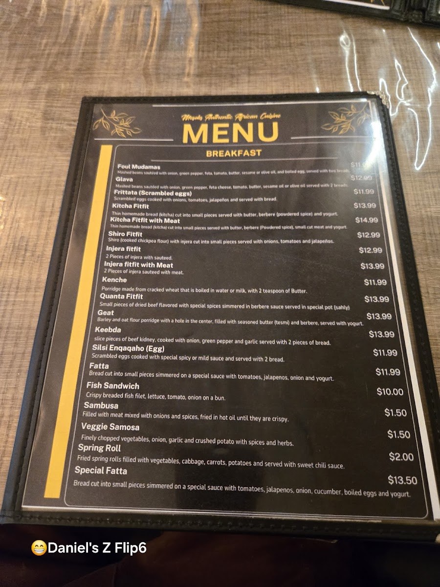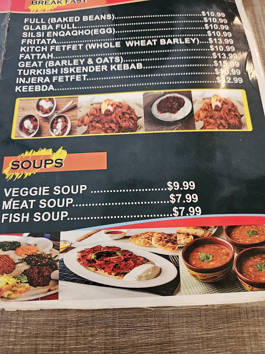 The diverse offerings provide options for those seeking vegetarian choices, traditional Ethiopian flavors, or a coffee shop experience, making the menu suitable for different meal times and casual dining settings.