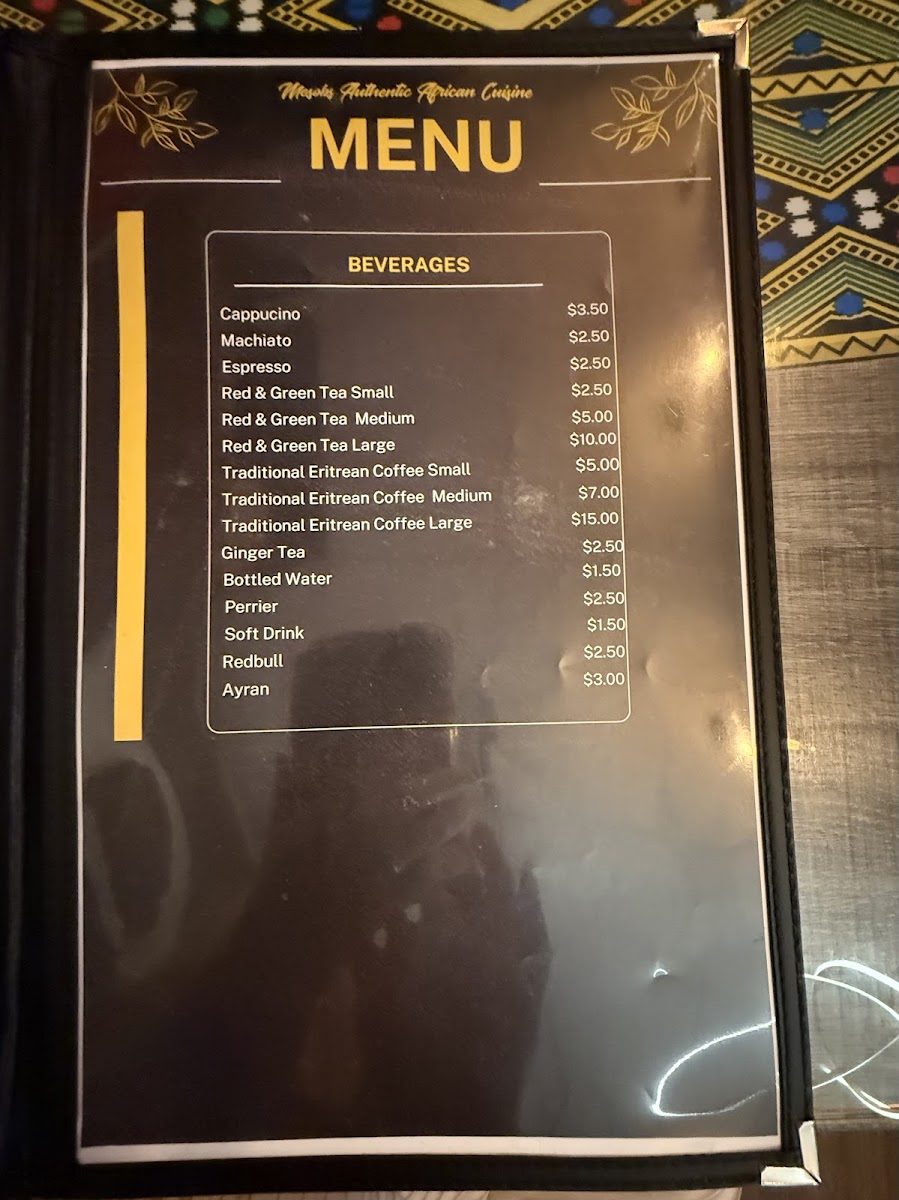 Beverages include a range of coffee selections such as cappuccino, macchiato, espresso, and traditional Eritrean coffee offered in various sizes. Tea options are available in red and green varieties along with ginger tea. The menu also features bottled water, soft drinks, Perrier, and energy drinks like Redbull.